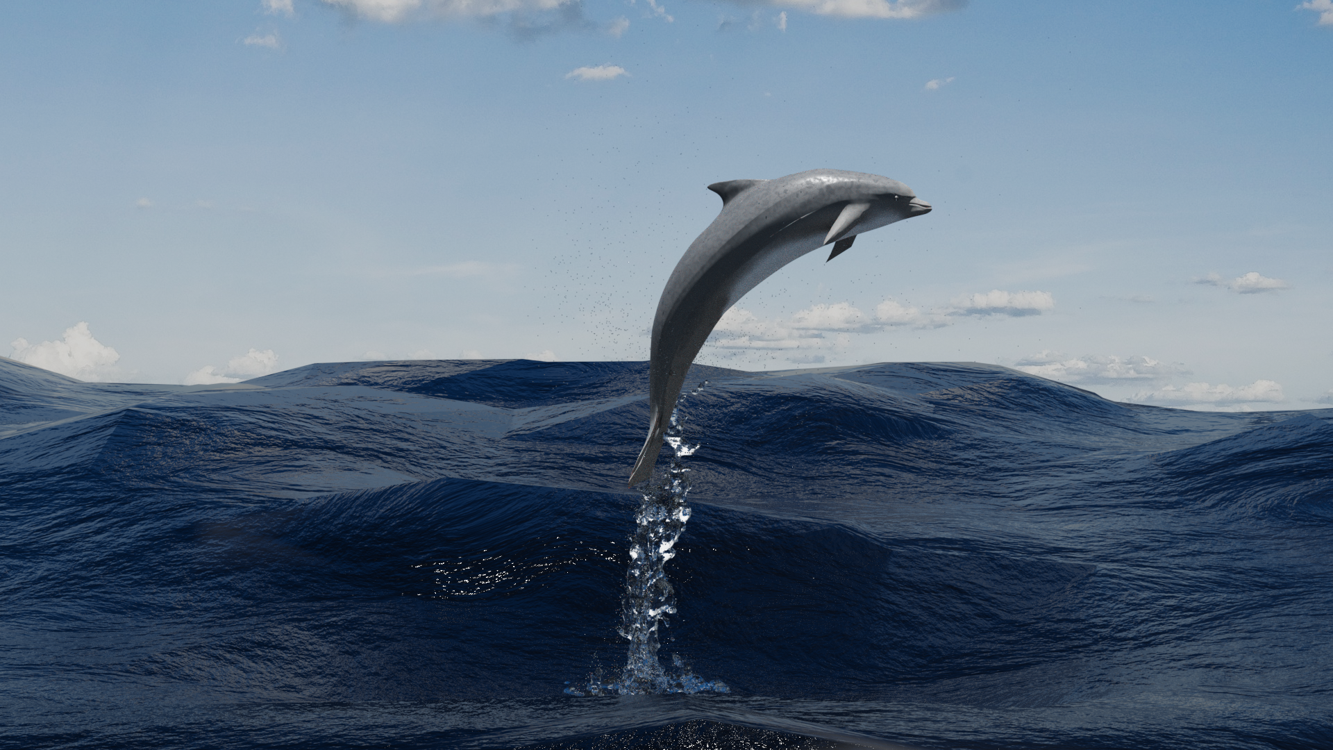 I used Blender 2.90 to create a 3D dolphin illustration and animate it. Everything except the sky was modeled in Blender. The sky is a background image taken from Pixabay.